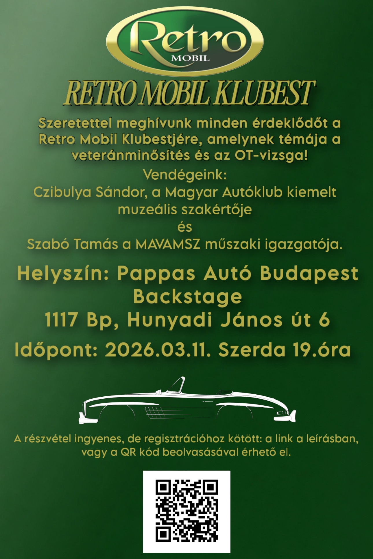 Március 11-én már a második Retro Mobil klubestünket rendezzük meg. A téma a veteránvizsga és a restaurálás. A terület igazi szakértőivel beszélgetünk a praktikákról, a buktatókról és a megoldásokról. Vendégünk lesz Czibulya Sándor a Magyar Autóklub kiemelt muzeális szakértője, és Szabó Tamás, a MAVAMSZ műszaki igazgatója is. Az esemény interaktív, a cél, hogy minél izgalmasabb beszélgetések alakuljanak ki.